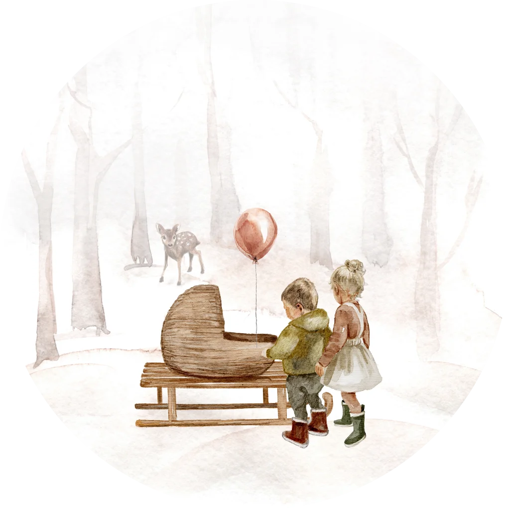 Sluitsticker voor een zusje. Deze sticker heeft een achtergrond van een bos in aquarel. In de verte staat een hertje. Voorop staat een slee met een wiegje. Naast de slee staat een oudere zus naast een broertje. Je kunt de kindjes ook weghalen als het jullie eerste kindje wordt. Past bij het geboortekaartje in dezelfde stijl. Je kunt deze sticker ook nog zelf aanpassen.