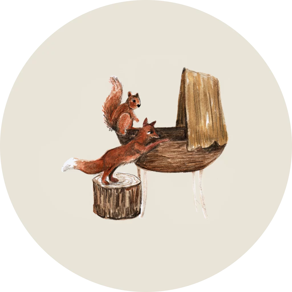 Sluitsticker om de envelop van je geboortekaartje mee dicht te plakken. De illustratie bevat een wiegje met bosdieren. Een vos en een eekhoorn kijken over de rand van de wieg.