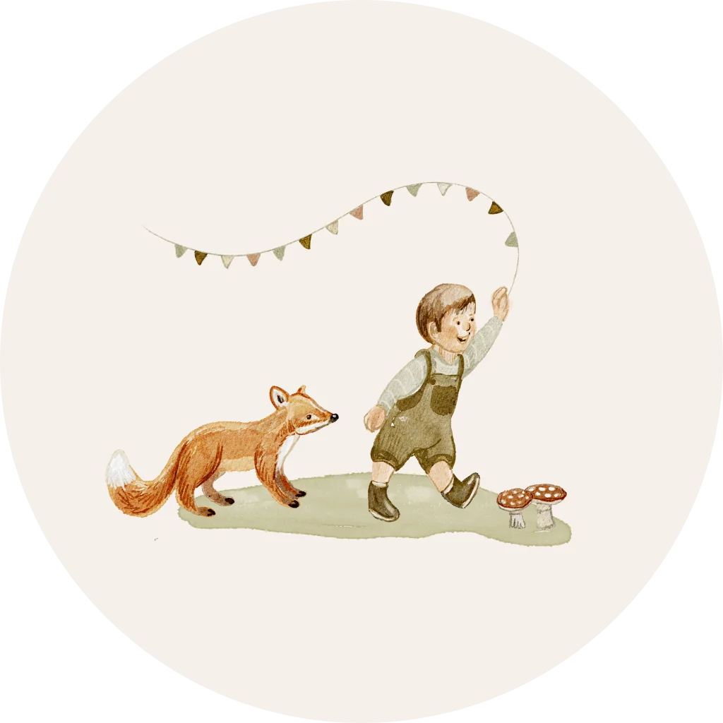 Sluitsticker voor bij je geboortekaartje met een jongen, een vos en vlaggen.
