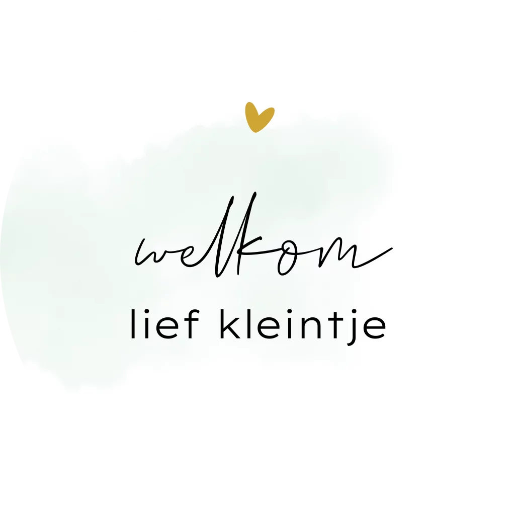 Sluitsticker geboorte met welkom lief kleintje en een okergeel hartje. Op de achtergrond staat groene waterverf. Je kunt deze sluitsticker zelf bewerken en aanpassen in onze editor.