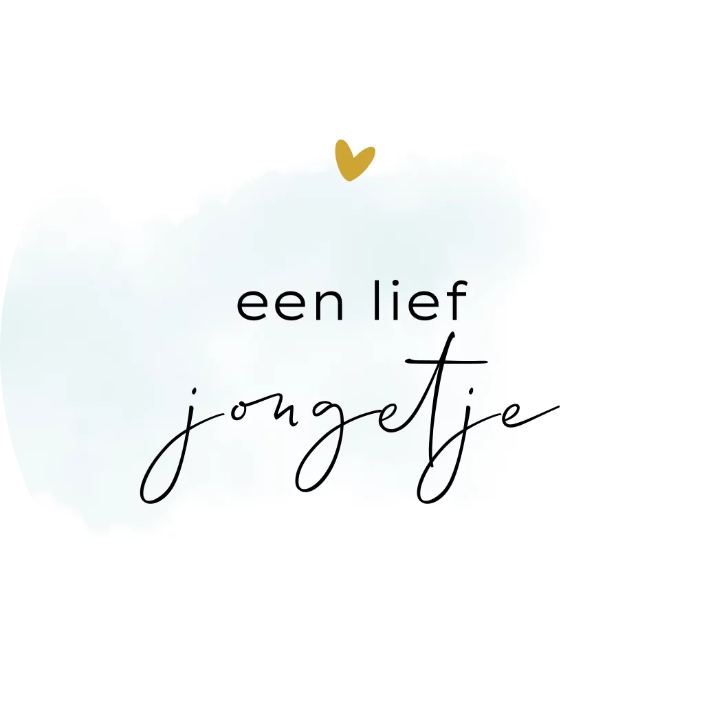 Sluitsticker geboorte een lief klein jongetje met een okergeel hartje. Op de achtergrond staat heel licht blauwe waterverf. Je kunt deze sluitsticker zelf bewerken en aanpassen in onze editor.