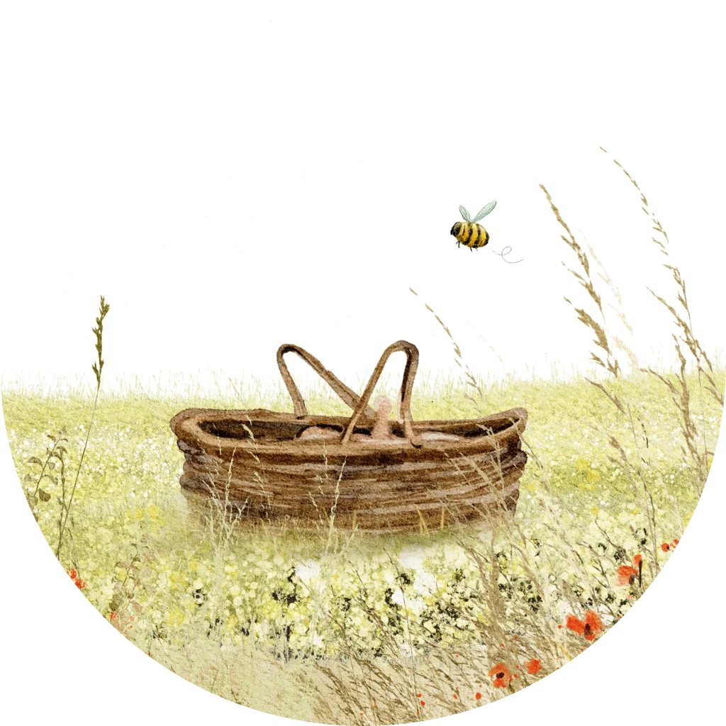 Sluitsticker voor geboorte met een mandje in het gras en veldbloemen.