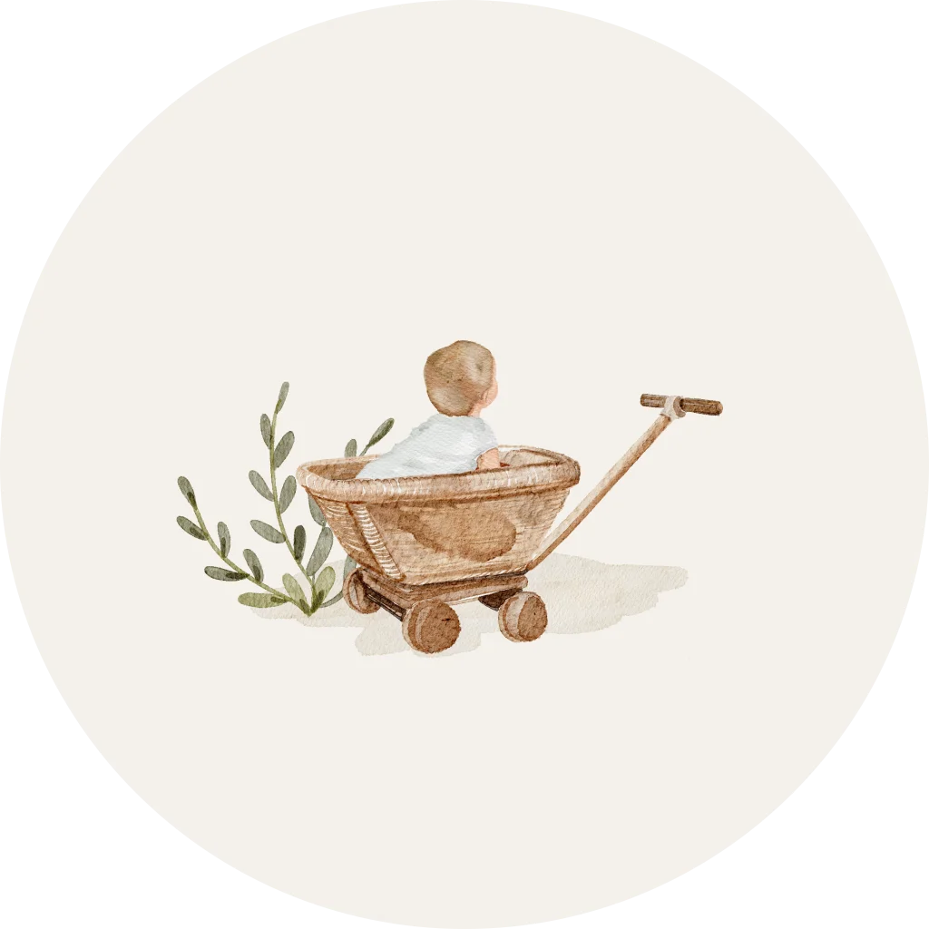 Sluitsticker voor je geboortekaartje met een baby jongen in bolderkar