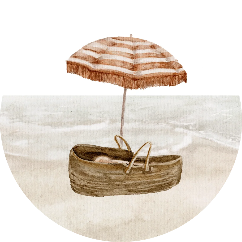 Sluitsticker geboortekaartje baby in mand met parasol strand