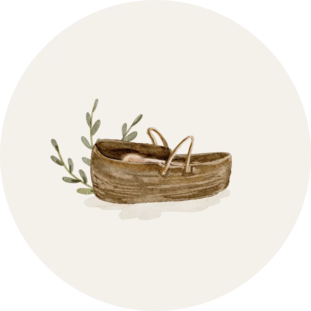 Unieke sluitsticker om de geboortekaartjes envelop te sluiten. Op de sticker staat een getekend mandje met een baby erin. Leuk voor jongens en meisjes en past goed bij onze getekende geboortekaartjes.