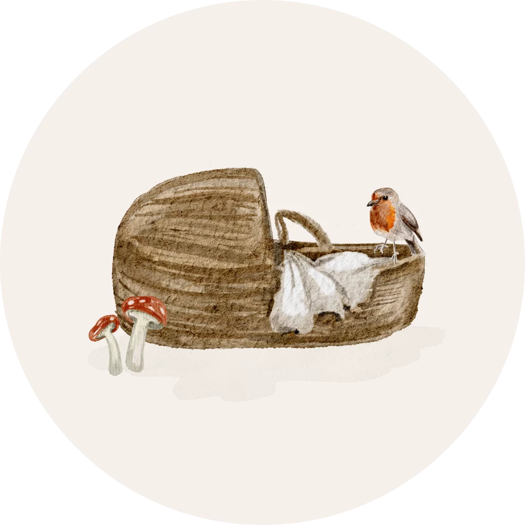 Sluitsticker voor een herfst geboortekaartje. Op de sticker staat een rieten wiegje met een vogel en paddestoelen.