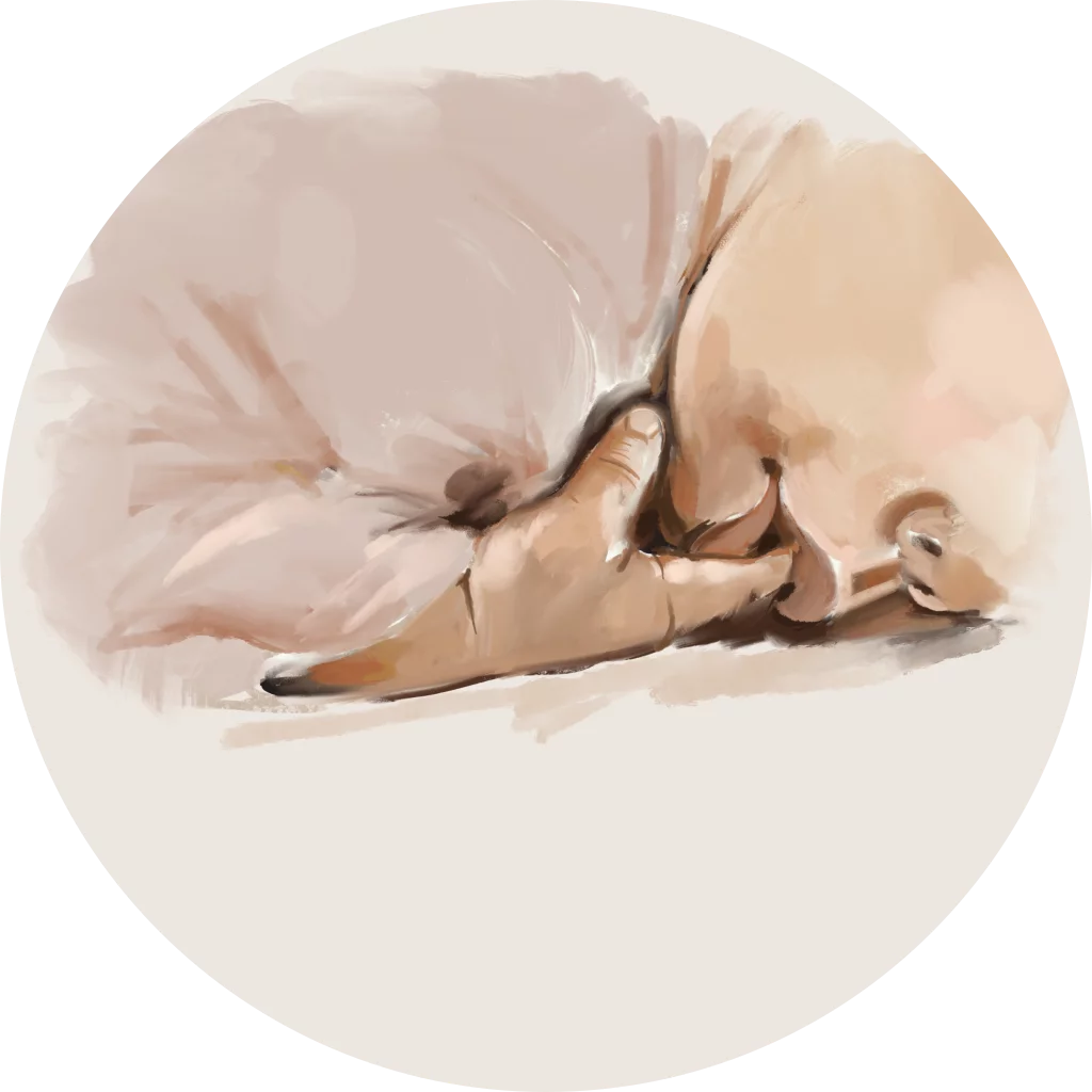 Sluitsticker met een illustratie van een slapend meisje in olieverf geschilderd.
