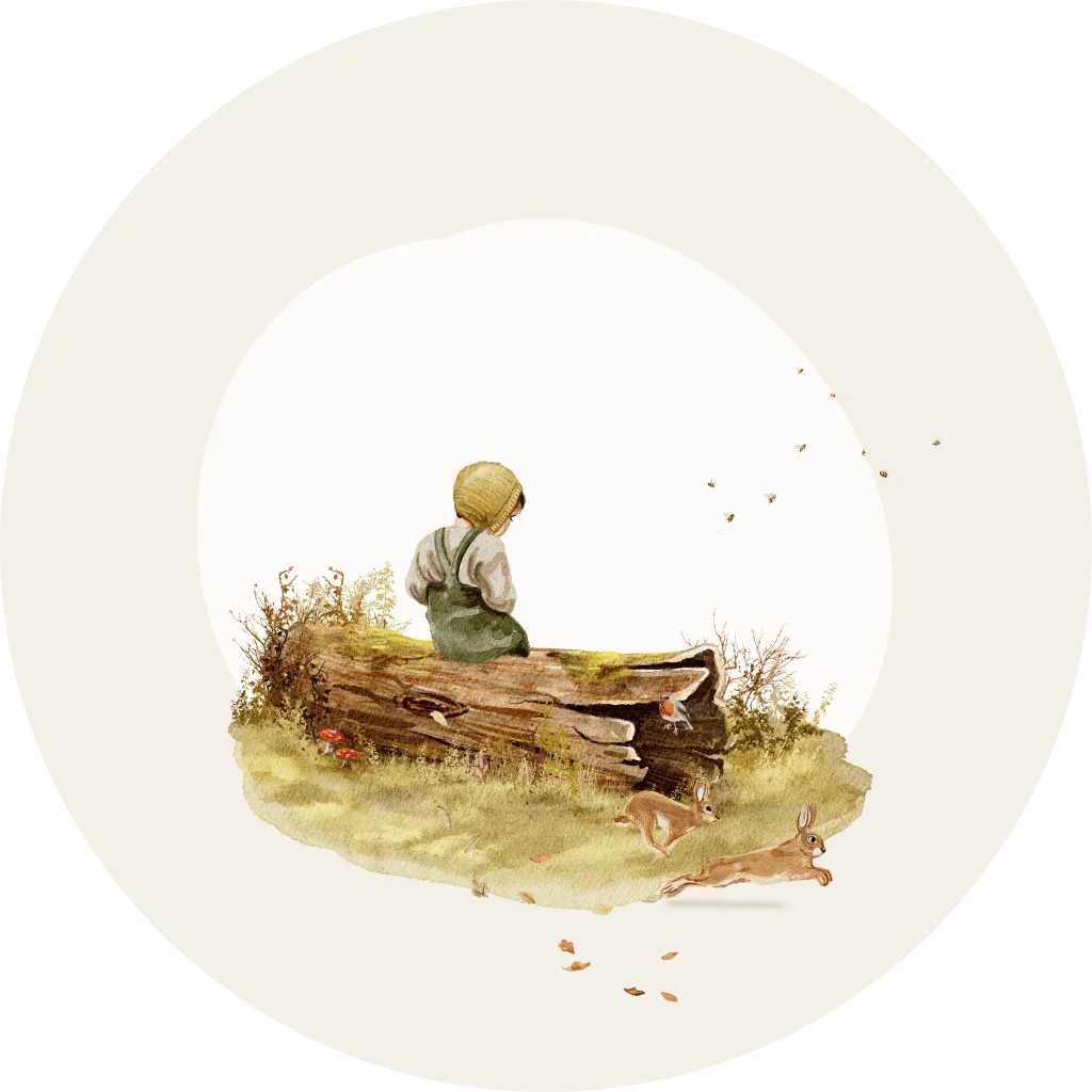Sluitsticker bijpassend bij je geboortekaartje met een illustratie van een jongen op een boomstam, omringd door rennende hazen. Ook leuk voor op een traktatie.