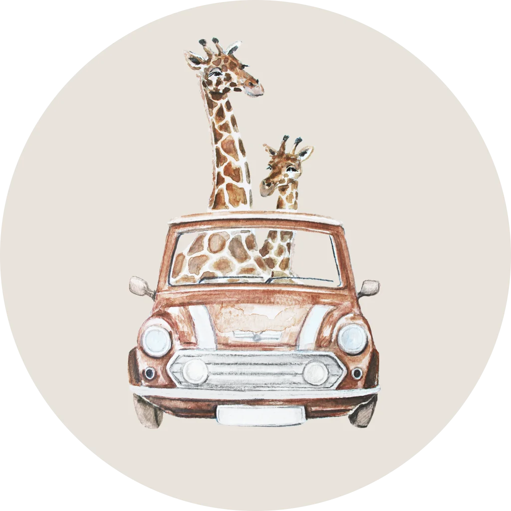 Een sluitsticker met originele illustratie van handgetekende giraffen in een minicooper. Je kunt de sticker bewerken in onze editor.
