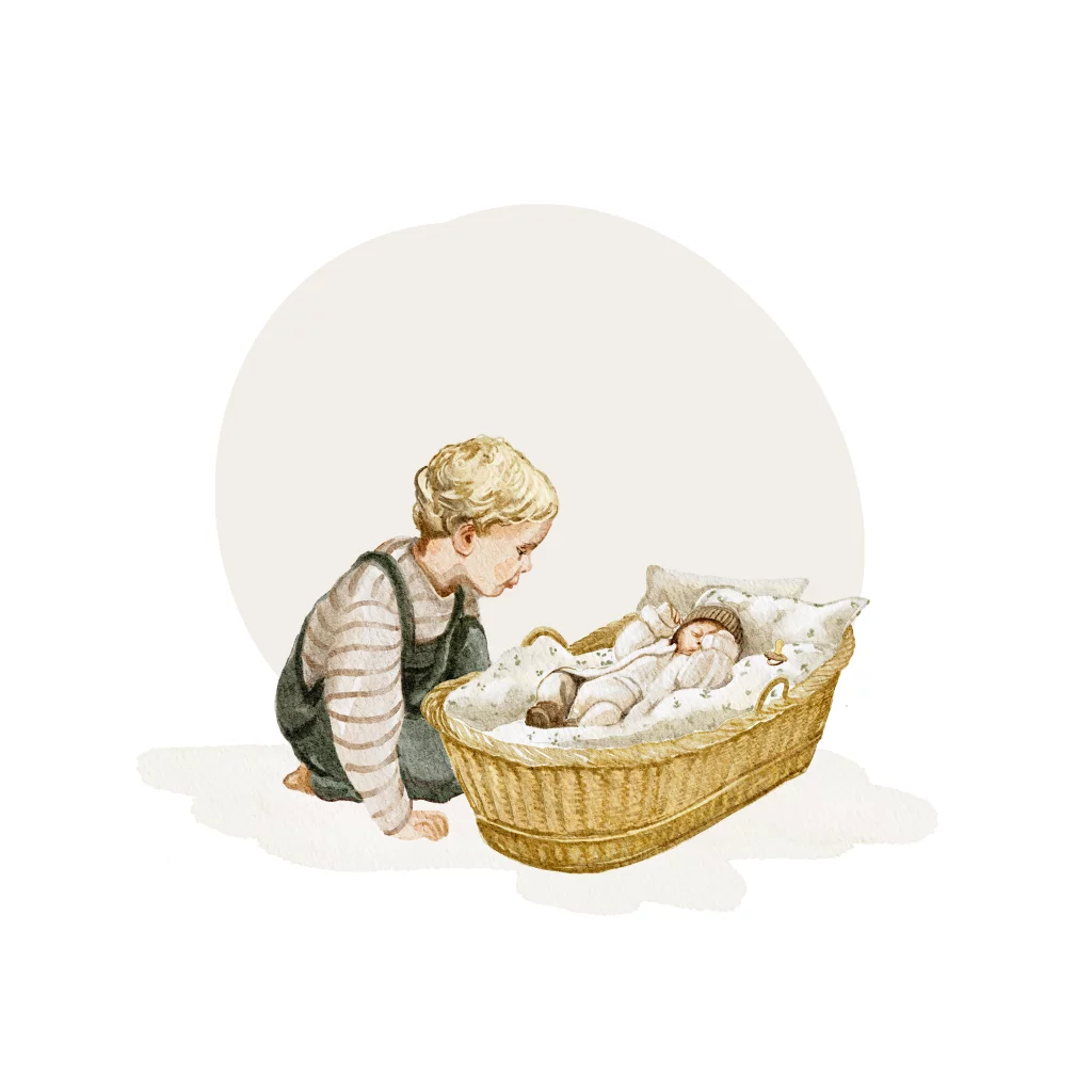 Mooie sluitsticker met een aquarel illustratie van een mandje met een baby en een grote broer Ook leuk voor op een traktatie.