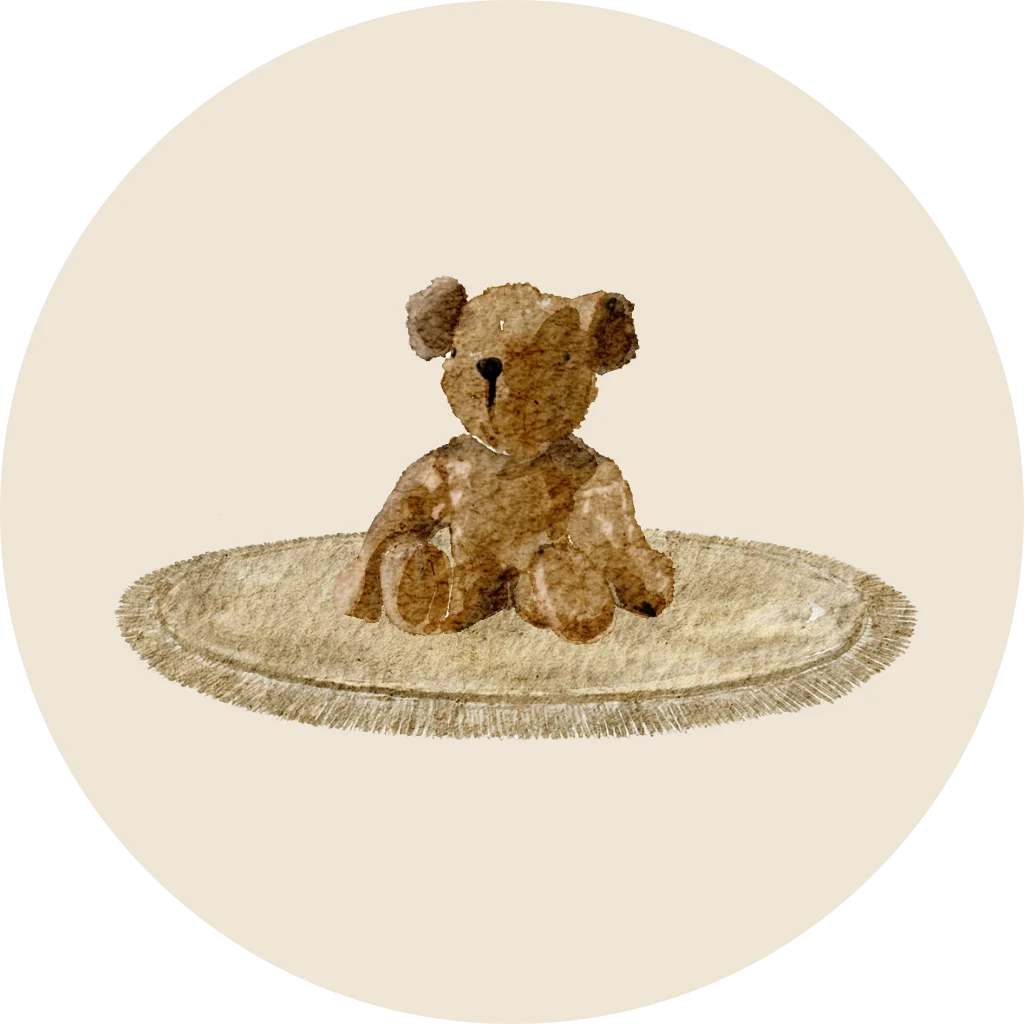 Sluitsticker voor een geboorte kaartje met een illustratie van een knuffelbeer op een kleedje. Je kunt deze sticker zelf personaliseren in onze editor.