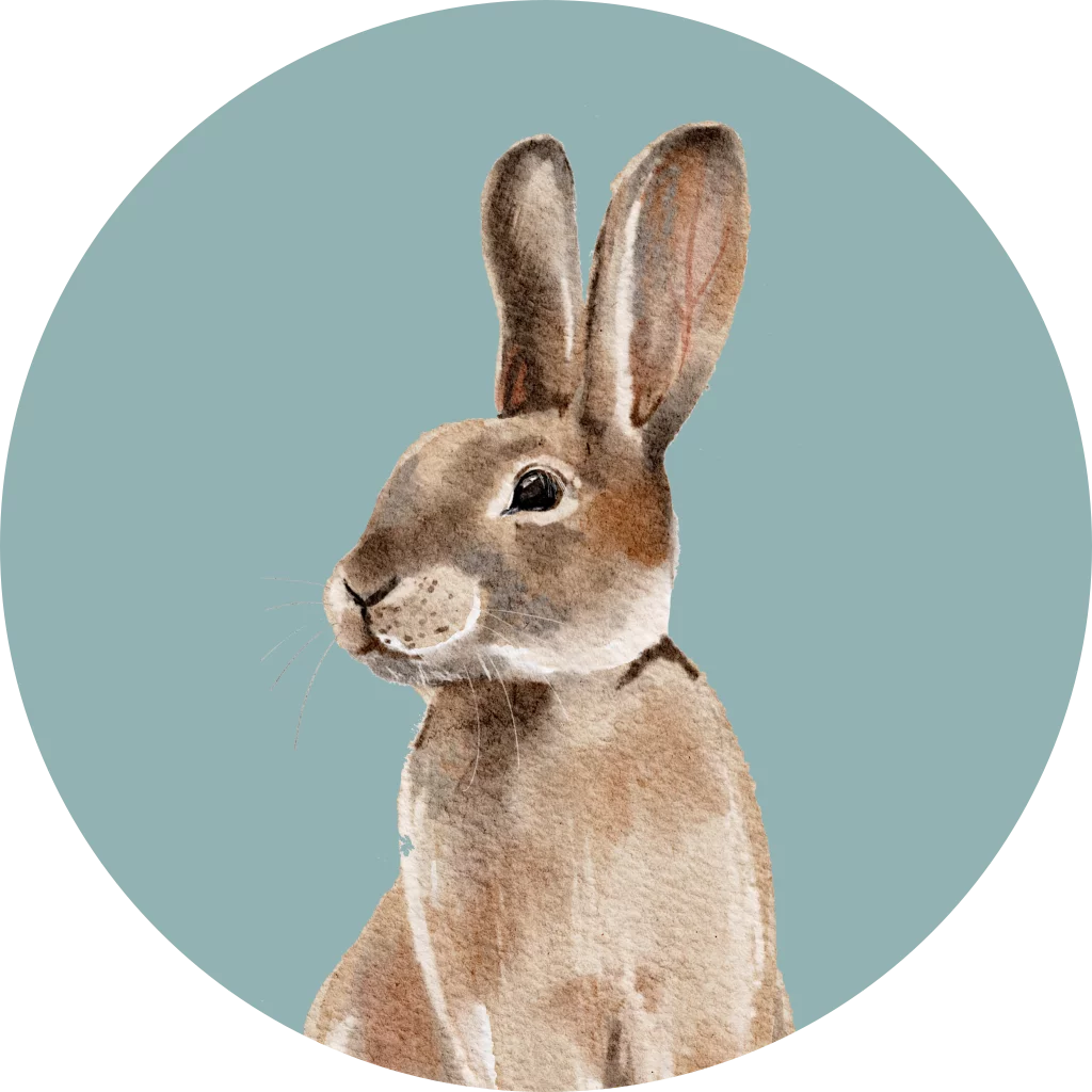Een sluitsticker met een lief konijn op een blauwe achtergrond. Je kunt de sticker zelf bewerken in onze editor.