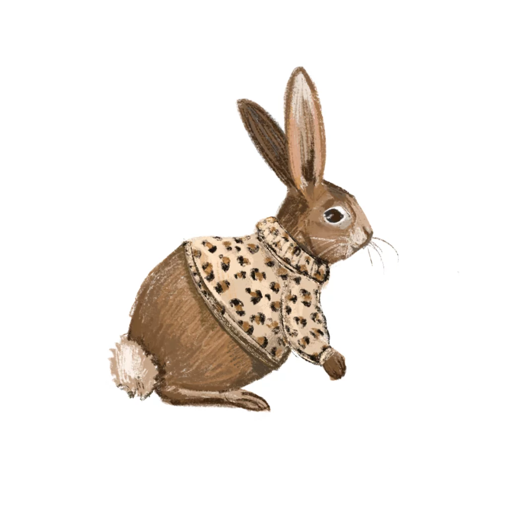 Sluitsticker met een konijn met een trui aan met een panterprint.