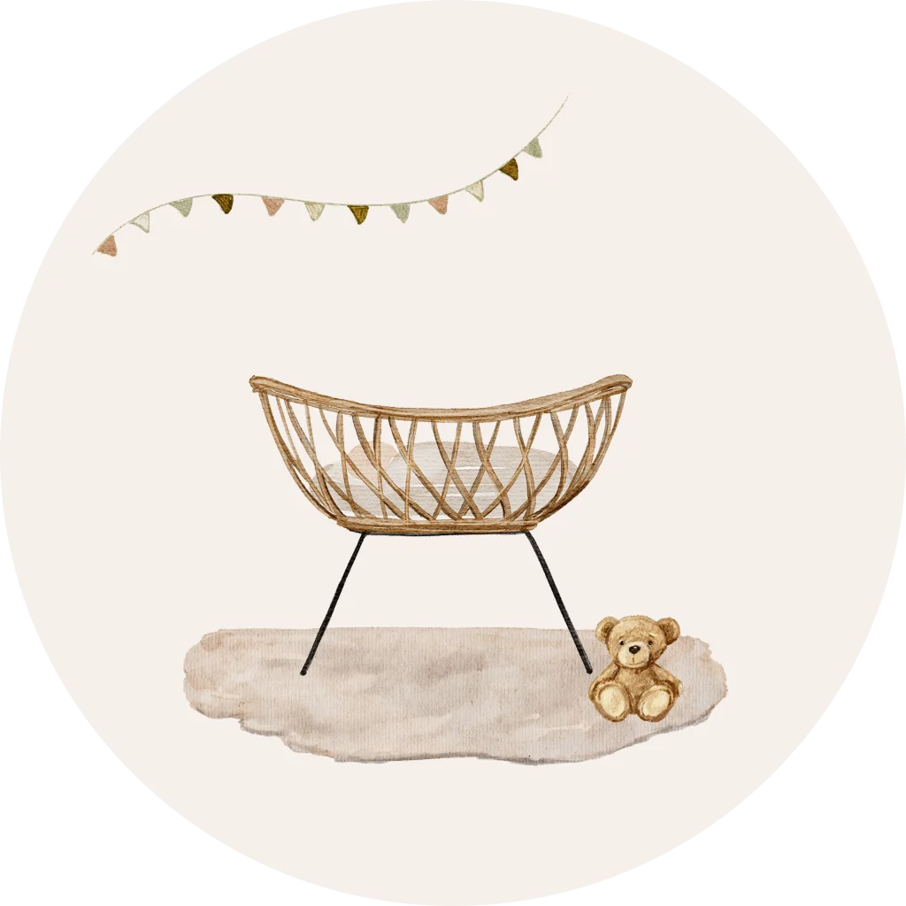 Mooie sluitsticker voor bij je geboortekaartje met een wiegje en een vlaggenlijn. Naast het wiegje staat een knuffelbeer. Ook leuk voor op een traktatie.