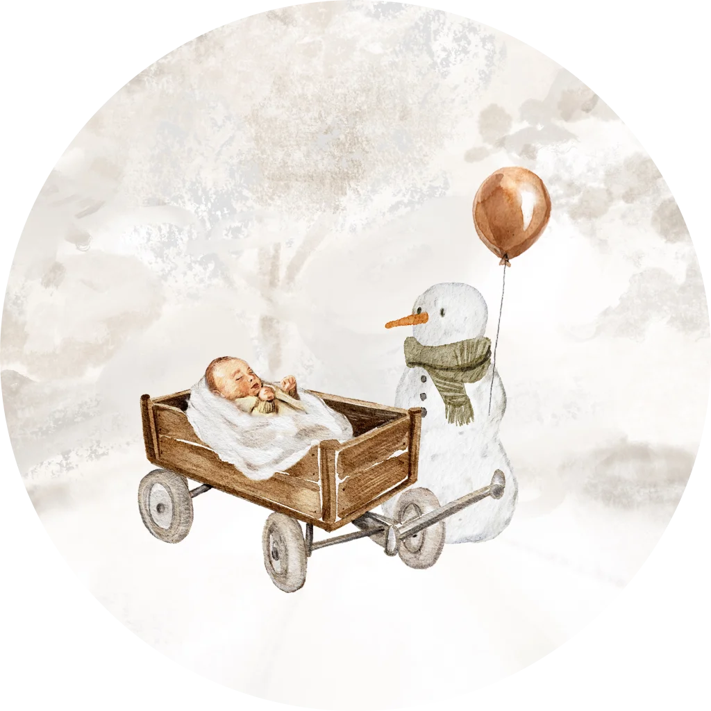 Sluitsticker voor geboorte met een baby in een winter landschap. Naast een kar met een baby staat een sneeuwpop met een oranje ballon.