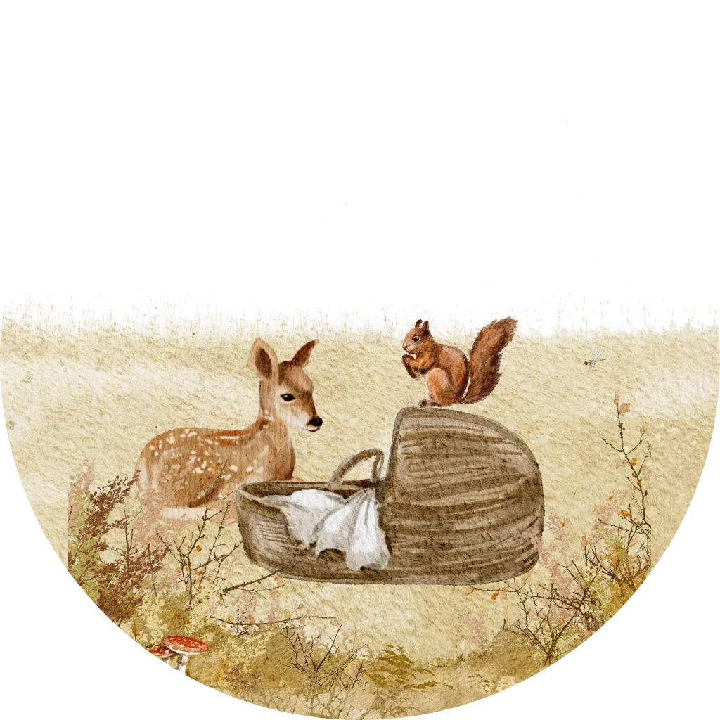 Sluitzegel geboorte in herfstthema. Het mandje staat in een landschap met daaromheen een hertje en een eekhoorn. De sticker heeft een diameter van 35 mm.