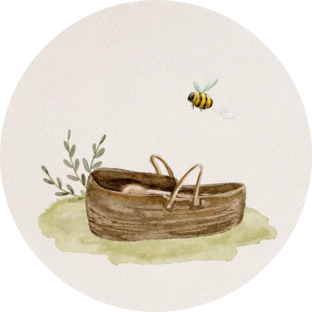 Sluitzegel geboorte baby in mandje met takje en een bijtje. De sticker heeft een diameter van 35 mm.
