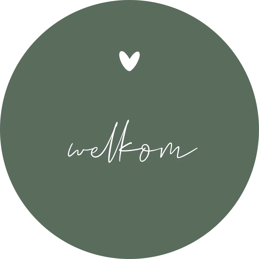 Donkergroene sluitzegel voor geboortekaartje met een klein wit hartje. Op de sticker staat welkom, maar je kunt deze tekst ook zelf naar wens aanpassen.