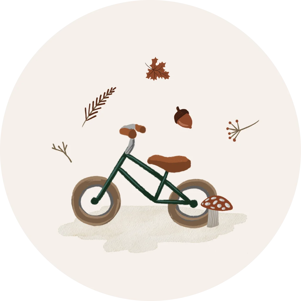 Sluitzegel geboortekaartje met een fiets voor een jongen. De sticker is echt in een herfstthema door alle blaadjes die rondvliegen. De sticker heeft een diameter van 35 mm.