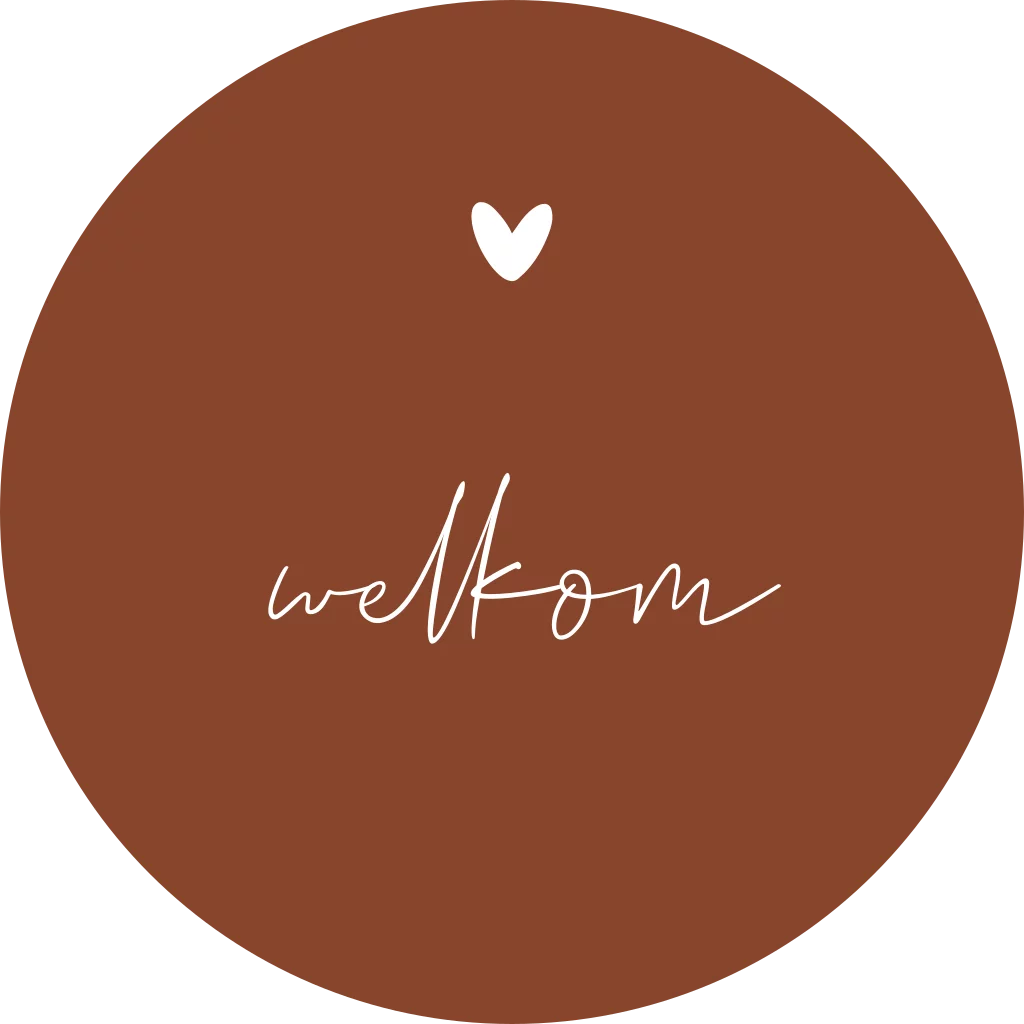 Roestbruine sluitzegel voor een geboortekaartje. Op de sticker staat welkom en een klein wit hartje. Deze sticker voor de geboorte kan je helemaal zelf aanpassen.