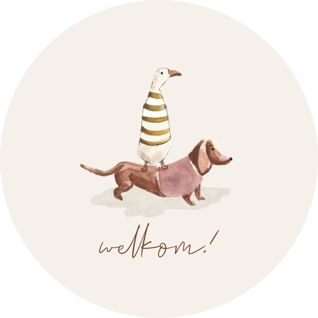 Vrolijke sticker met dieren. Op een teckel met een roze jasje staat een gans in een streep truitje. Originele sluitsticker voor je geboortekaartje of uitnodiging. De tekst welkom kan je aanpassen of verwijderen.