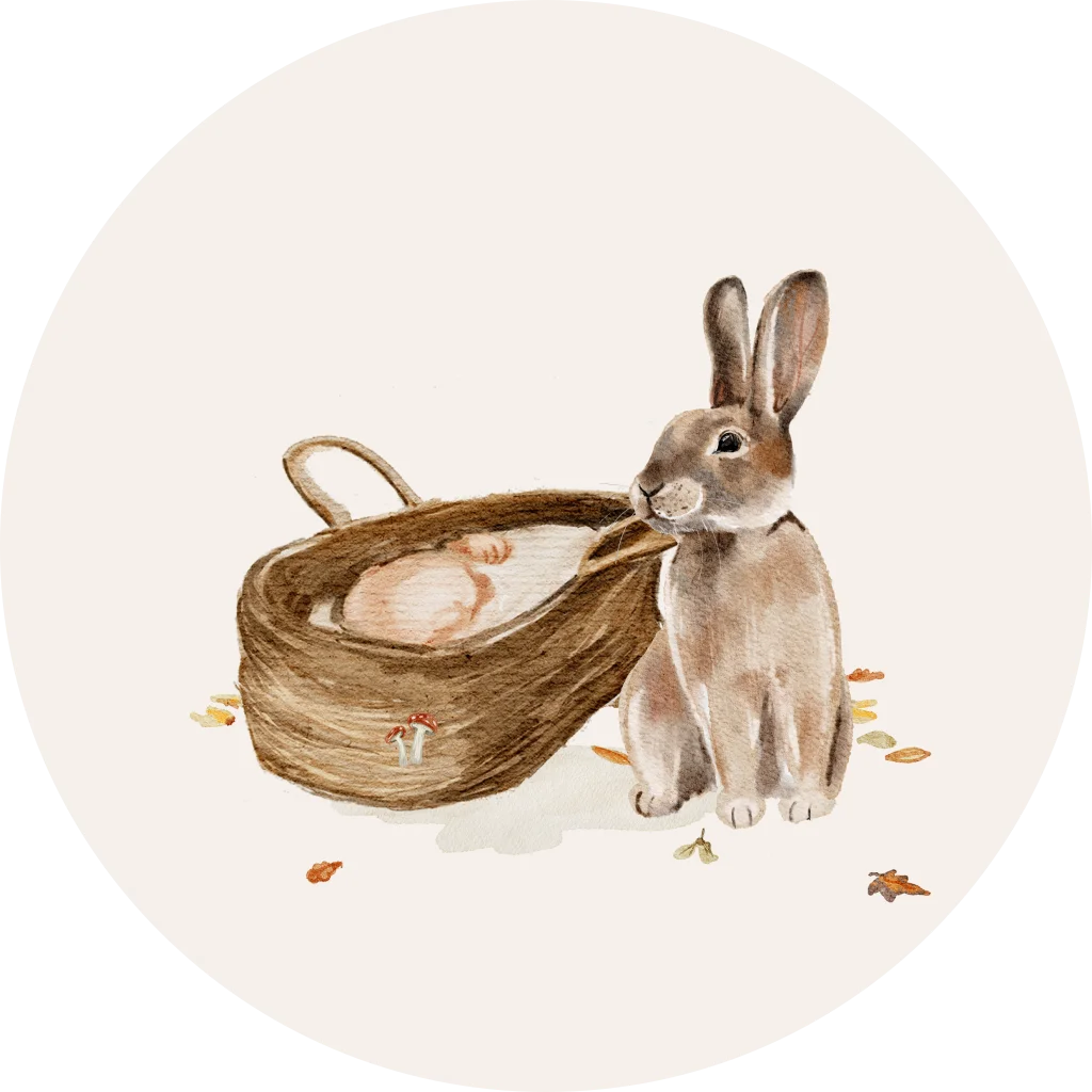 Sticker geboorte babymandje met konijn en hefstblaadjes. De sticker heeft een diameter van 35mm.