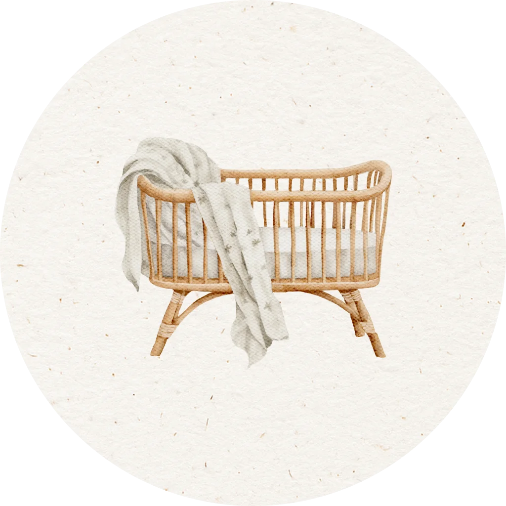 Stickers met een achtergrond van een foto van structuurpapier. Daarop een illustratie van een klein wiegje. Deze stickers zijn ook mogelijk met foliedruk. 25 stuks per vel.