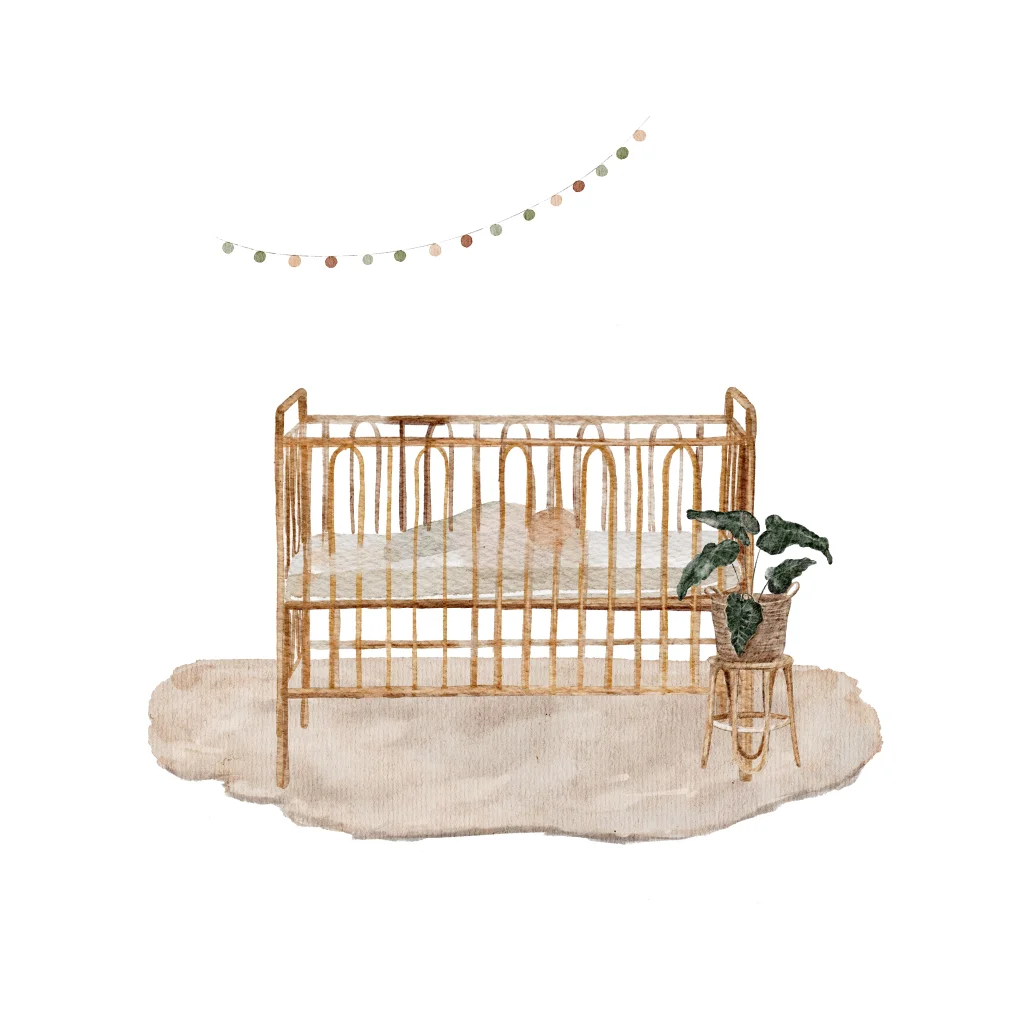 Sticker geboorte met ledikantje, plant en slingers. De sticker heeft een diameter van 35mm.