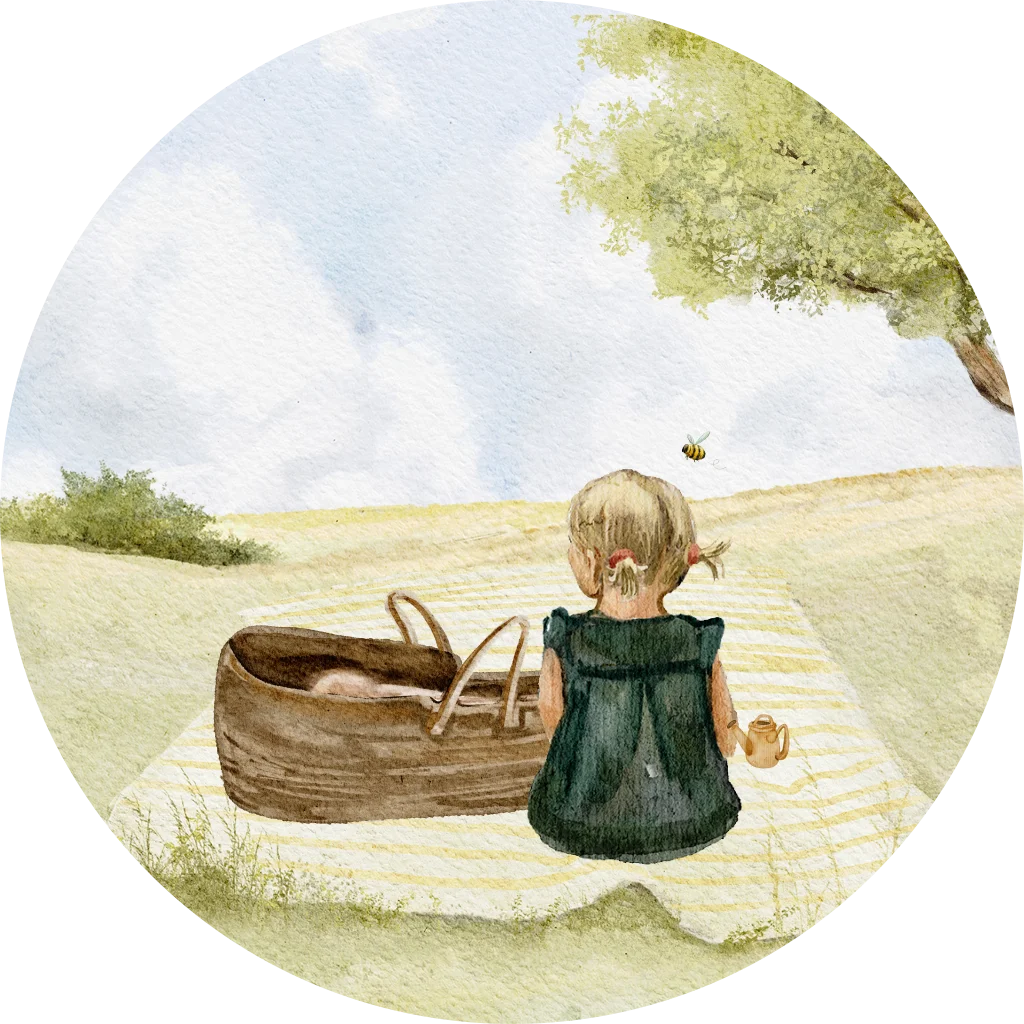 Sticker geboorte met meisje in mandje met grote zus in lente thema! De sticker heeft een diagram van 35 mm.