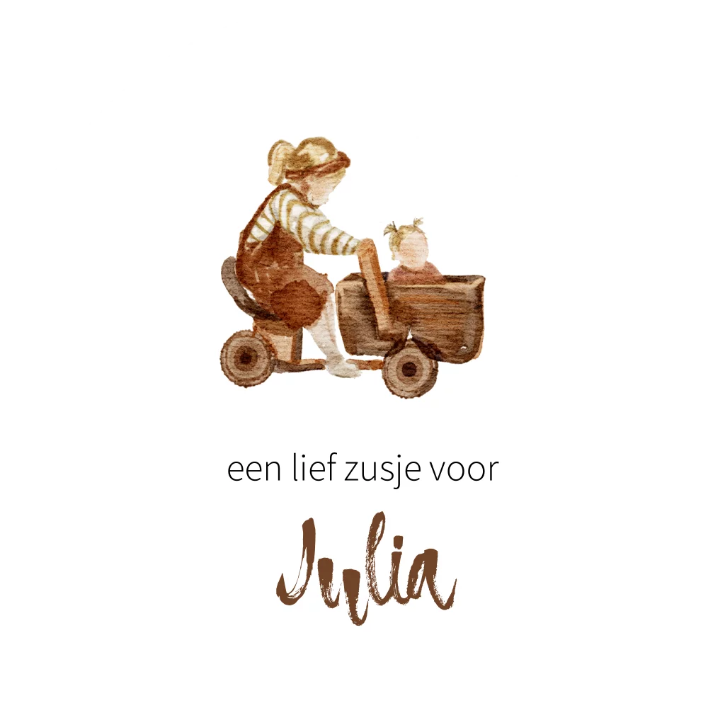 Sticker voor de geboorte van een zusje met een grote zus op een bakfiets met een baby meisje erin. Je kunt de sticker zelf helemaal bewerken, leuk voor een traktatie.