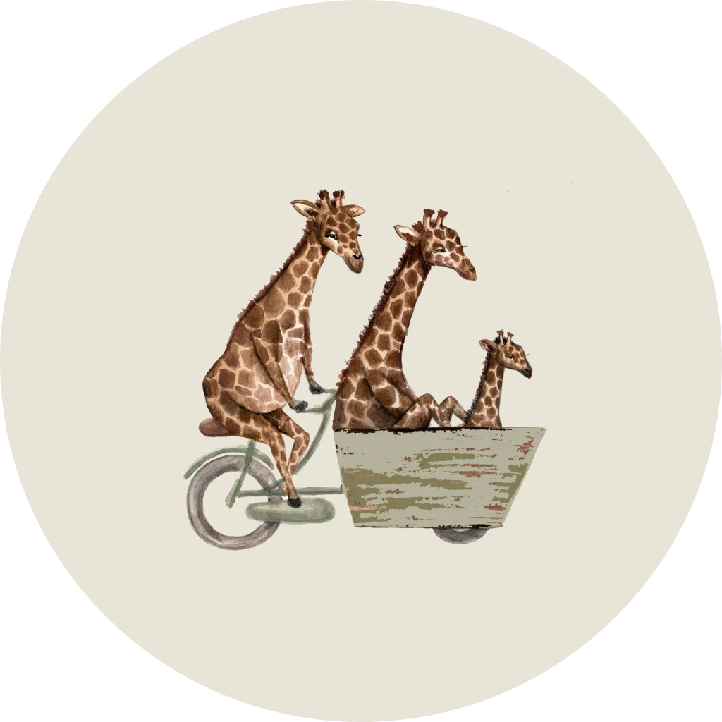 Deze vrolijke jungle sticker heeft een illustratie van giraffen op een bakfiets. De sticker kan je zelf personaliseren, bijvoorbeeld door een naam toe te voegen.