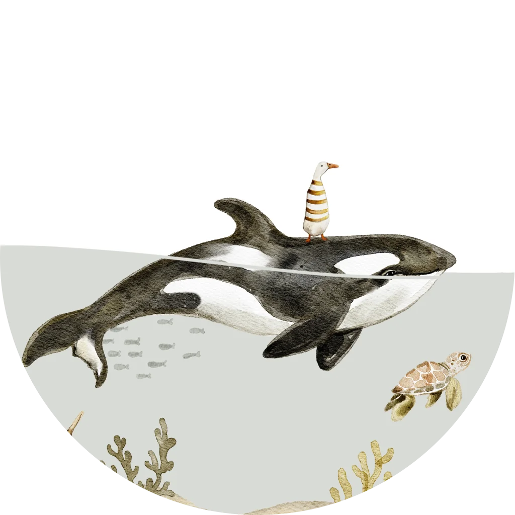 Unieke sluitsticker voor een geboortekaartje met een prachtige orka en andere waterdieren. Perfect om de envelop stijlvol af te sluiten en helemaal in het thema van de geboorteaankondiging te blijven. Voeg een speelse en bijzondere touch toe aan je geboortepost!