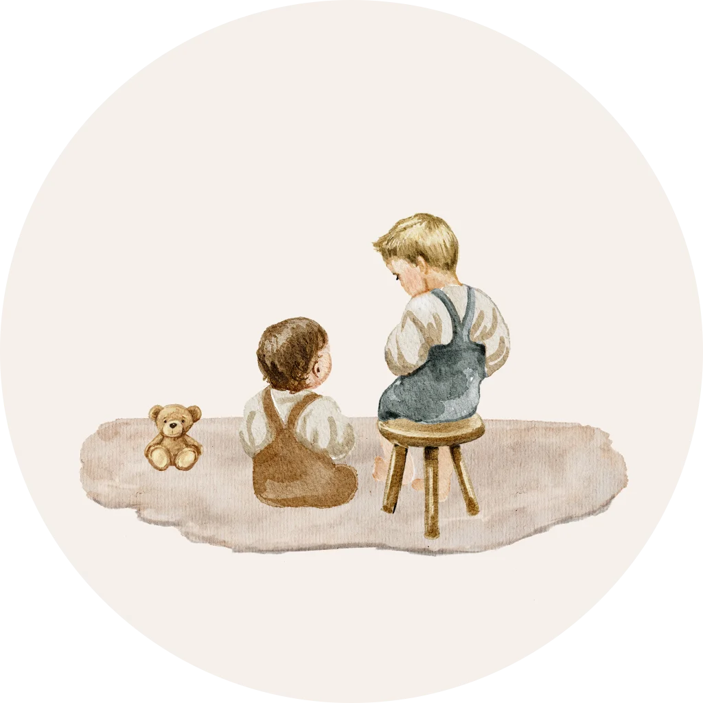 Winterse sluitsticker voor een zusje met daarop een illustratie van een haardvoor een broertje op een krukje, en een ander broertje op het kleed. Daarnaast staat een knuffelbeer. Passend bij het geboortekaartje in dezelfde stijl. Ook leuk voor een traktatie.