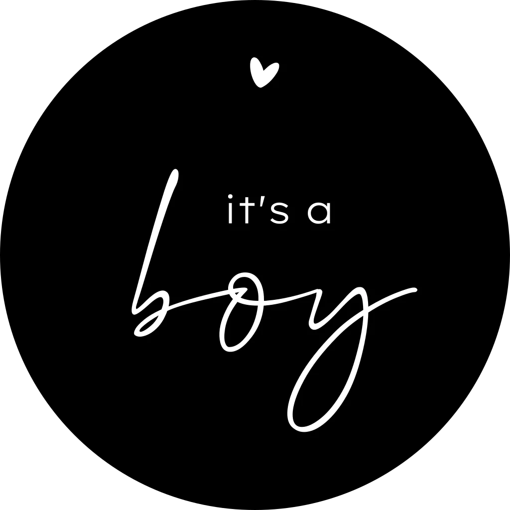 Zwarte sluitsticker met wit hartje en tekst it's a boy