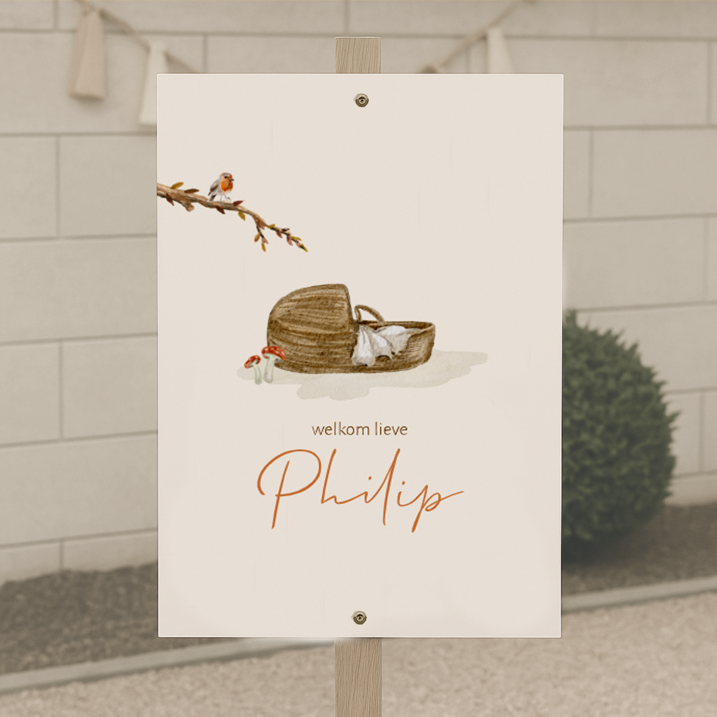 Vier de geboorte van jullie kindje met een tuinbord. Zo kan iedereen zien dat er bij jullie een kleintje is geboren. Dit bord heeft een mandje met een baby en paddestoelen. De unieke illustraties maken dit bord extra leuk!