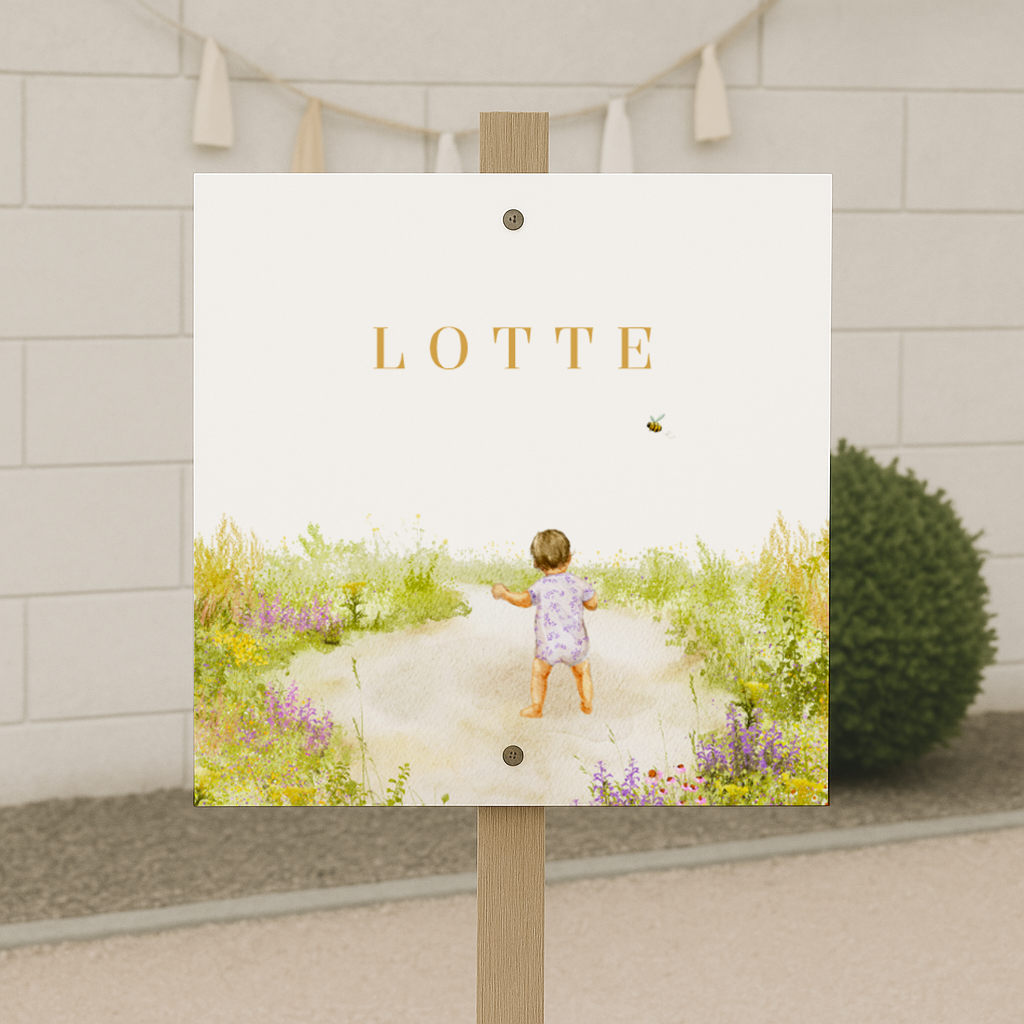 Een vrolijk en stijlvol tuinbord waarmee jullie op een originele manier laten zien dat jullie dochter is geboren – vol zomer, bloemen en een vleugje goud.