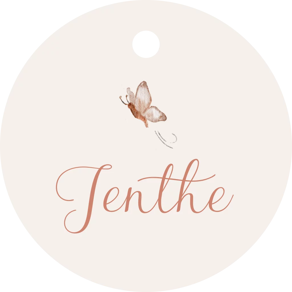 Ronde doopsuiker of traktatie labels met de naam en een illustratie van een roze vlinder. Je hoeft er alleen nog maar een touwtje doorheen te doen en aan je doopsuiker te hangen.
