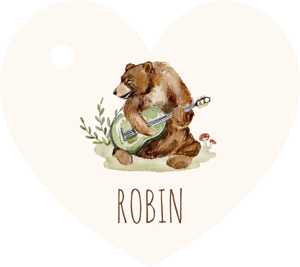 Ben je op zoek naar een vrolijke traktatie. Met dit leuke label in de vorm van een hartje kom je vast een heel eind. Op het labeltje staat een beer met een gitaar. Vrolijk label met een boorgaatje die je kunt gebruiken voor een doopsuiker of traktatie. Je hoeft alleen nog maar een klein cadeautje erbij te zoeken en je bent klaar.