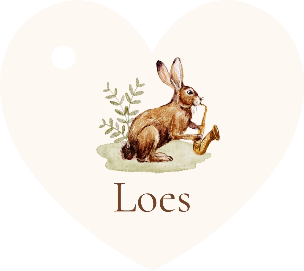 Wil je leuke traktaties maken, dan is dit leuke labeltje misschien wel leuk. Dit label in de vorm van een hartje bevat een getekend haasje met een trompet. Vrolijk label die je kunt gebruiken bij een doopsuiker of traktatie. Er zit al een boorgaatje in, dus zoek een klein cadeautje, touwtje erom en je bent klaar om te trakteren.