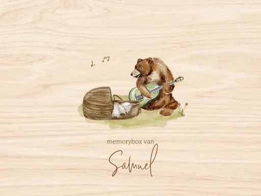 Memorybox voor geboortekaartje met een schattige illustratie van een beer met een gitaar en een baby in een mandje is met zorg ontworpen en met de hand geschilderd in waterverf, wat het een warme, persoonlijke uitstraling geeft. Bewerk deze box in de editor en personaliseer met een eigen naam en tekst.