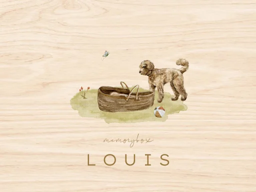 Leuke memorybox voor een geboorte met een afbeelding van een mandje met een baby en daarbij een labradoodle. Bij deze box hebben we ook een passend geboortekaartje.