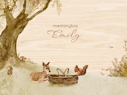 Memorybox in herfst stijl met een hertje, een mand, een grote boom, paddestoelen en een eekhoorn.. Een herinneringsbox om alle dierbare momenten van de zwangerschap en/of babytijd veilig te bewaren. De box kan volledig gepersonaliseerd worden in onze online editor. Deze grenen houten box heeft een afmeting van 40x30 cm en is 13 cm hoog, met handgrepen aan beide zijden.
