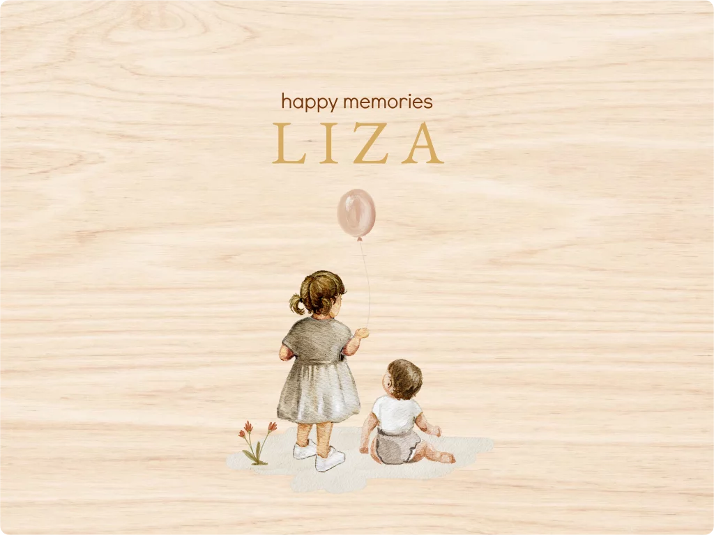 Memorybox met een illustratie van een grote zus en een kleiner zusje met een roze ballon. Een herinneringsbox om alle dierbare momenten van de zwangerschap en/of babytijd veilig te bewaren. De box kan volledig gepersonaliseerd worden in onze online editor. Deze grenen houten box heeft een afmeting van 40x30 cm en is 13 cm hoog, met handgrepen aan beide zijden.