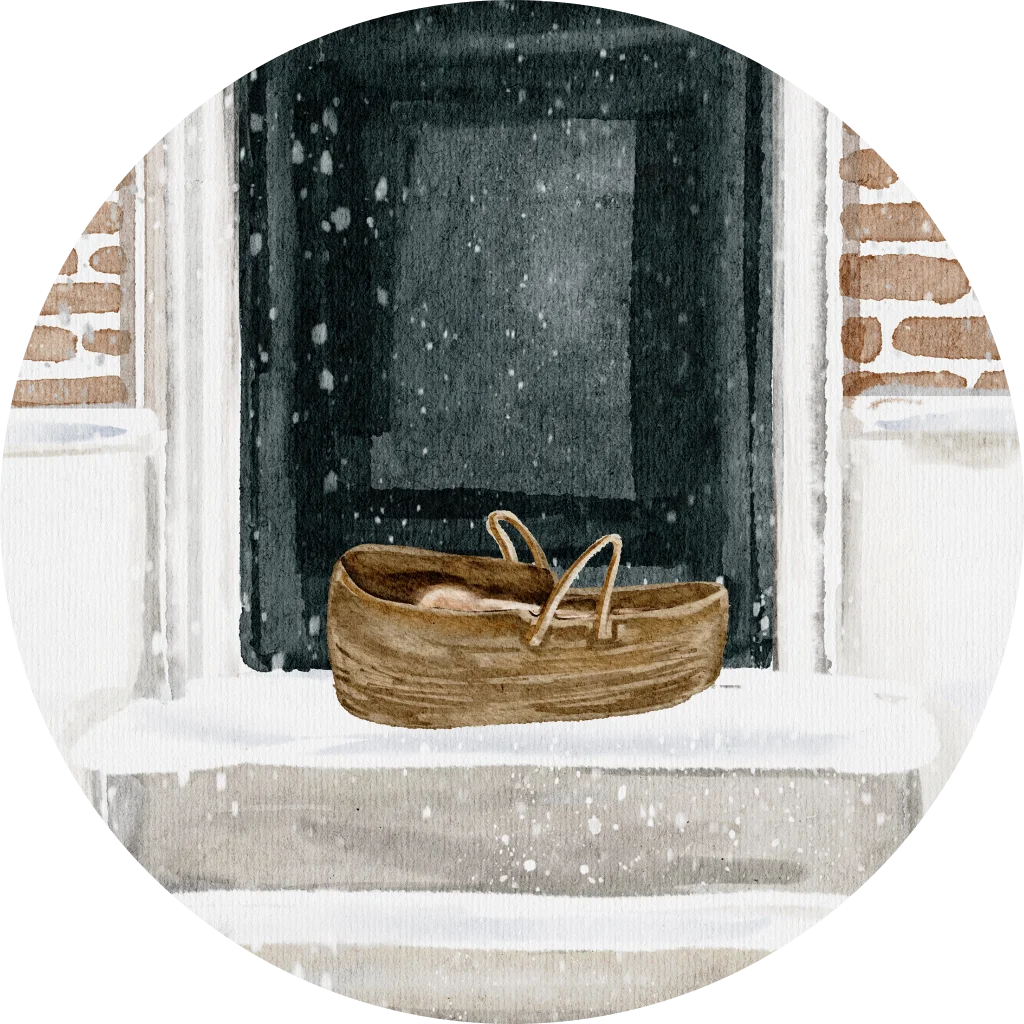 Een getekende winter sluitsticker met een baby in de sneeuw. Deze sluitsticker kan je gebruiken om bijvoorbeeld de envelop dicht te plakken van een geboortekaartje.