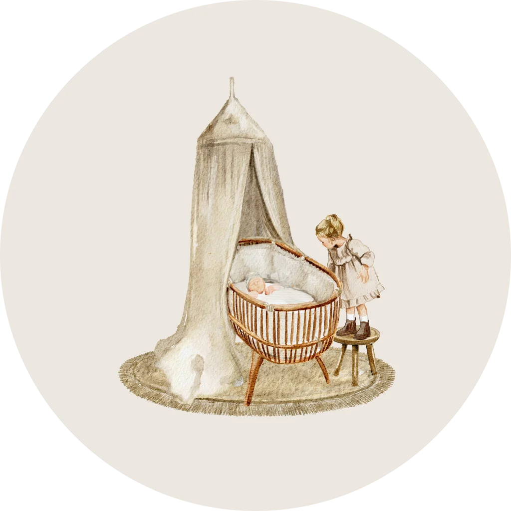 Maak het geboortekaartje compleet met deze charmante sluitzegel! Deze sluitzegel, perfect voor het verzenden van jullie speciale aankondiging, toont een illustratie van een wieg met een lief zusje ernaast. Het ontwerp straalt warmte, zorg en liefde uit, en voegt een persoonlijke en stijlvolle touch toe aan het geboortekaartje.