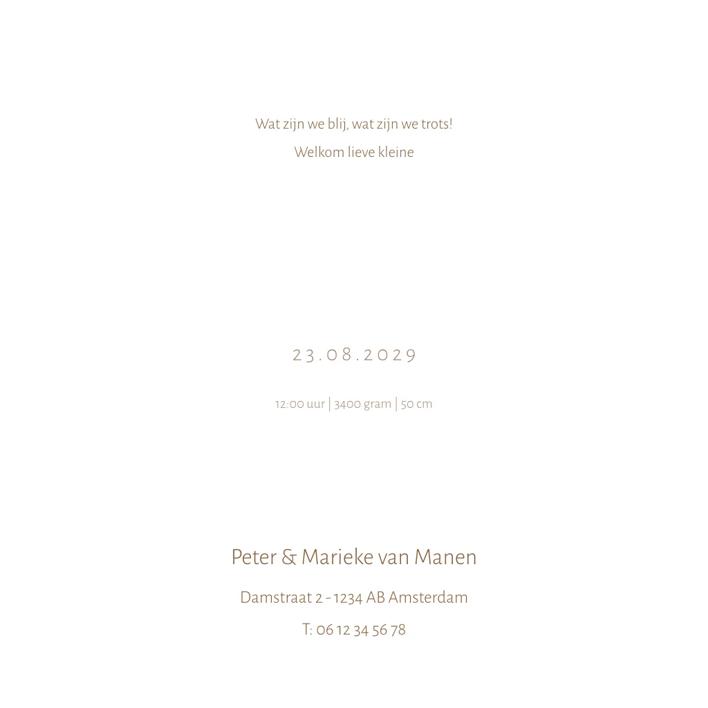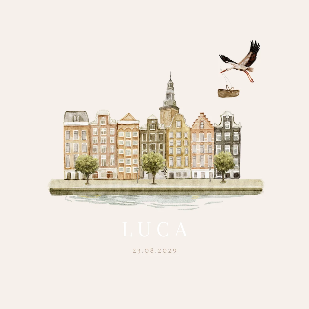 Welkom bij onze collectie geboortekaartjes met een unieke twist! Ons geboortekaartje "Grachtenpandjes Amsterdam ooievaar getekend" is een prachtig ontworpen kaartje dat perfect is voor ouders die in Amsterdam wonen. De charmante huisjes zijn met liefde getekend in een aquarel stijl, waardoor elk kaartje een uniek en illustratief karakter heeft. Dit geboortekaartje is zowel geschikt voor jongens als meisjes. De toevoeging van een ooievaar die met een mandje met een baby aan komt vliegen, geeft het kaartje een speelse en vertederende uitstraling. Kies voor dit unieke kaartje voor jullie kleintje en verras je familie en vrienden met dit prachtige geboortekaartje. De naam wordt gedrukt in glanzend goudfolie.