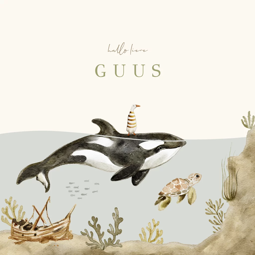 Welkom bij onze collectie geboortekaartjes, waar we trots zijn om het vierkante enkele geboortekaartje met een betoverende onderwaterwereld en een schattige getekende orka te presenteren. Dit kaartje straalt avontuur en speelsheid uit, perfect voor ouders die op zoek zijn naar een unieke aankondiging voor de geboorte van hun kindje. Met zijn illustratieve ontwerp van een onderwaterwereld en een orka met op zijn rug een schattige eend, is dit geboortekaartje perfect voor gezinnen die van dieren en natuur houden. De toegevoegde elementen van avontuur maken dit kaartje ideaal voor ouders die een stoer en avontuurlijk gevoel willen overbrengen. Dit luxe geboortekaartje is geschikt voor zowel jongens als meisjes, met zijn neutrale kleuren en vintage uitstraling. De combinatie van natuurlijke tinten zorgt voor een tijdloze en elegante uitstraling, terwijl de toegevoegde illustraties van onderwaterdieren een zomers tintje geven. Of je nu op zoek bent naar een geboortekaartje voor je eerste kindje of voor een groter gezin, dit kaartje past perfect bij elke gelegenheid. Kies voor dit geboortekaartje en laat je verrassen door de magische wereld die het met zich meebrengt. Met zijn unieke ontwerp en tijdloze uitstraling zal dit dieren geboortekaartje zeker indruk maken op al je vrienden en familieleden.