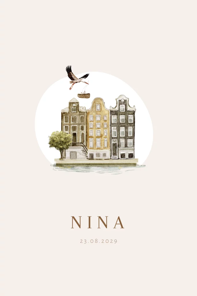 Welkom bij onze collectie geboortekaartjes met een unieke twist! Ons geboortekaartje "Grachtenpandjes Amsterdam ooievaar aquarel getekend" is een prachtig ontworpen kaartje dat perfect is voor ouders die in Amsterdam wonen of een andere stad met grachtenpandjes. De charmante huisjes zijn met liefde getekend in een aquarel stijl, waardoor elk kaartje een uniek en illustratief karakter heeft. Dit geboortekaartje is zowel geschikt voor jongens als meisjes. De toevoeging van een ooievaar die met een mandje met een baby aan komt vliegen, geeft het kaartje een speelse en vertederende uitstraling. Kies voor dit unieke kaartje voor jullie kleintje en verras je familie en vrienden met dit prachtige geboortekaartje.