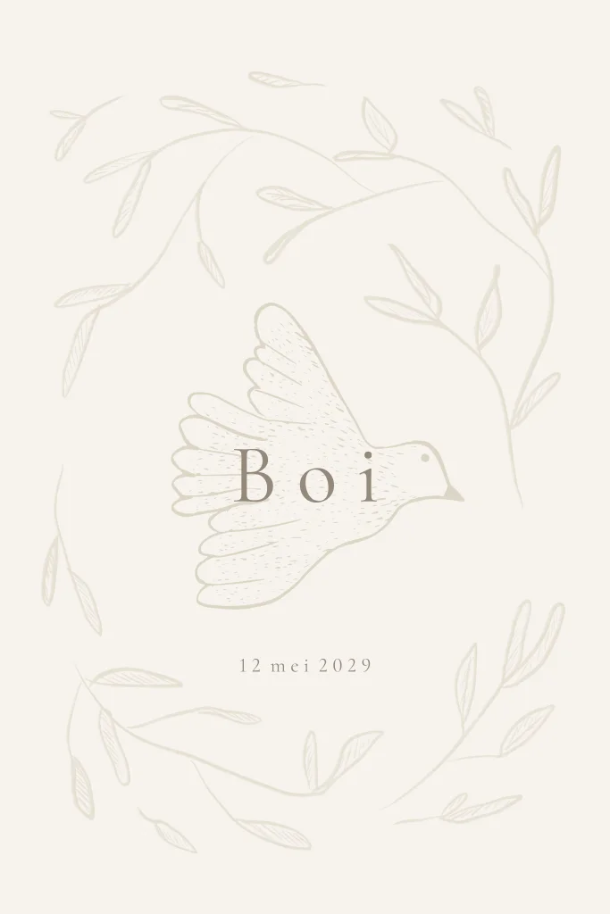 Dit lieve geboortekaartje in naturel tinten straalt rust uit, met zijn prachtige lijn getekende takjes en duif. De mogelijkheid om de kleuren aan te passen zorgt ervoor dat dit kaartje zich moeiteloos aanpast aan de persoonlijke voorkeuren van elke ouder.