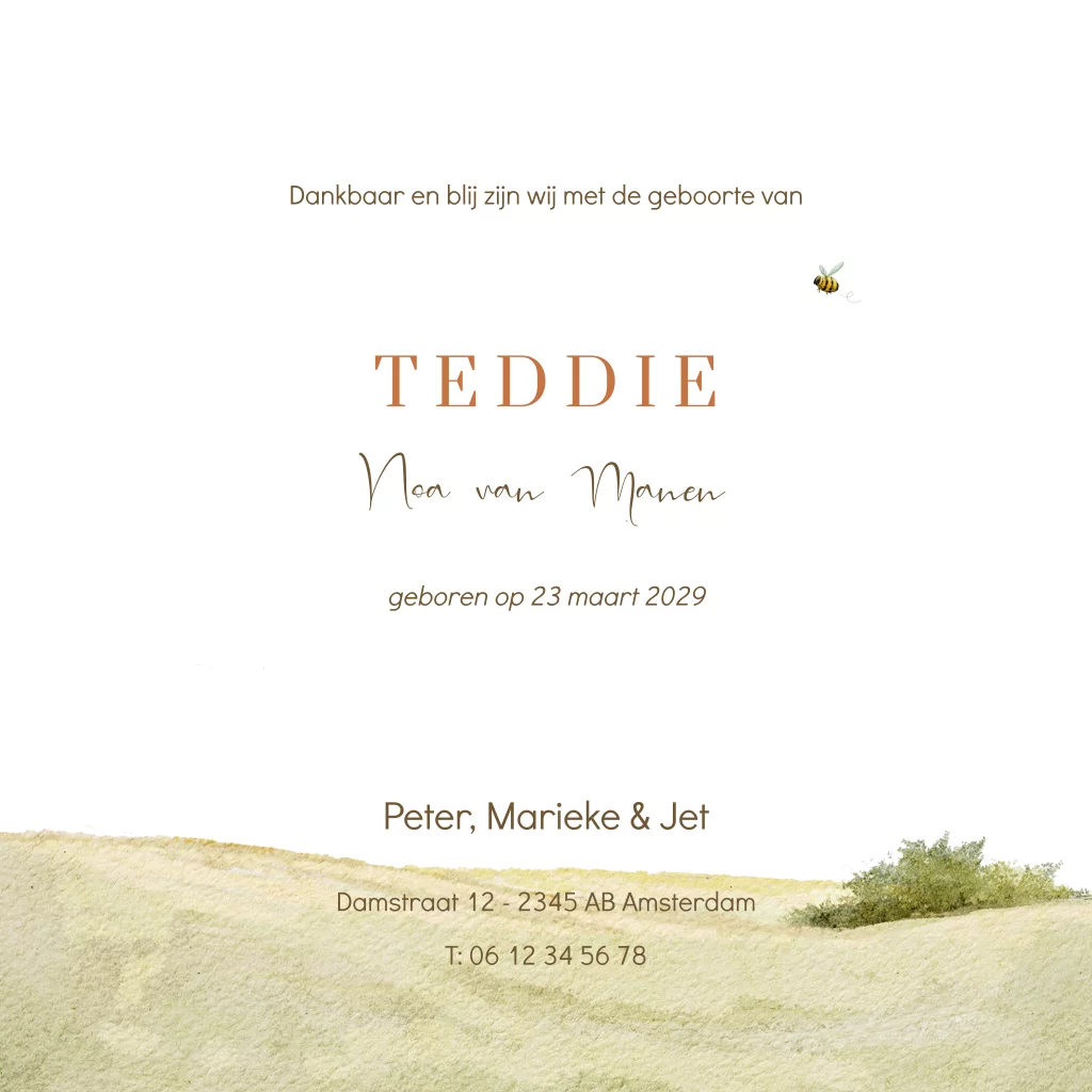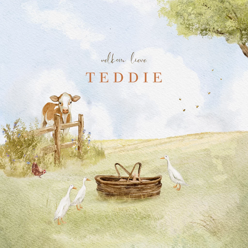 Wanneer je op zoek bent naar een uniek geboortekaartje, is dit kaartje met getekende aquarel illustraties perfect. De prachtige tekening van een grasveld met Hollandse wolkenlucht is een mooie basis voor dit kaartje voor jullie kleintje. De kleine baby ligt in een babymandje en daarbij zijn loopeenden getekend die nieuwsgierig in het mandje kijken. In de verte staat een kalfje achter een hek. Dit geboortekaartje is uniek en origineel, en perfect voor een lente- of zomerbaby. Je kunt alle illustraties op dit kaartje zelf aanpassen, verwijderen of nieuwe tekeningen toevoegen. Boerderij thema.